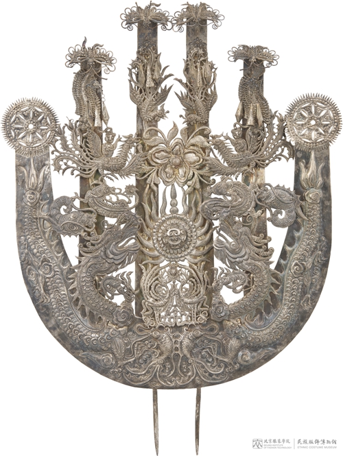 鳳冠為銀質(zhì),使用鏨花與花絲工藝,冠上飾有鳳鳥、蜻蜓、螳螂、蝴蝶、蜜蜂等,精巧細(xì)致,為黃平苗族新娘所戴。裝飾紋樣受漢族文化影響,體現(xiàn)了民族文化的融合。