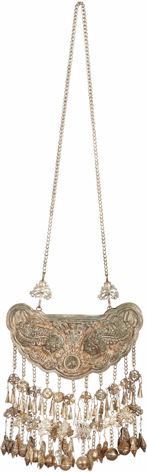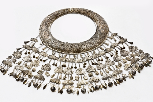 這套銀飾為貴州省黔東南苗族侗族自治州、清水江畔的臺(tái)江施洞地區(qū)苗族女孩在成年禮、姊妹節(jié)、苗年、出嫁、獨(dú)木龍舟節(jié)等節(jié)慶時(shí)穿用,包括頭飾、頸飾、首飾、衣飾等,重約14公斤。在苗族,銀飾是財(cái)富的象征,也是地域、民族識(shí)別的符號(hào)。