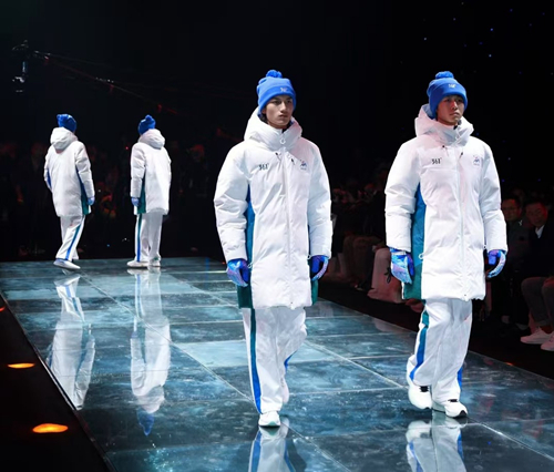 作為亞冬會開賽前重要儀式之一,火種采集意味著此次國際綜合性冰雪運動盛會大幕已然開啟。活動中9位火種采集使者,身著白色運動服裝,手持特制采火工具,臉上洋溢著激動與自豪的笑容。火種采集使者服裝以月白色為主色調,與冰雪世界相融成畫;整體采用3D立體剪裁技術,H型外套與高彈修身長褲高度貼合穿著者的形體特點;結合上肩結構,確保肩臂充足活動空間,加強服裝保型性;去掉服裝外層絎縫線跡,外觀視覺更加簡潔大方;帽里以雅灰色系雪花圖案作為點綴,搭配紅色羊絨圍巾,與亞冬會會場氛圍相得益彰。