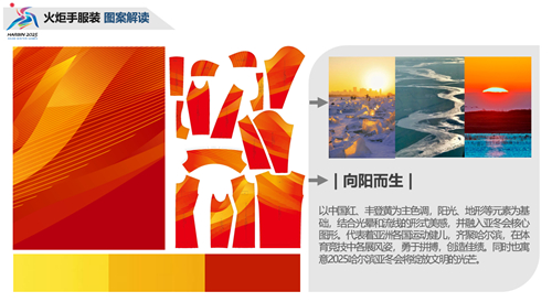 據悉,即將于2月3日開啟的亞冬會線下火炬傳遞活動中,火炬手服裝設計靈感主要來源于黑龍江哈爾濱的地理特征。作為中國最早迎接日出的省份,太陽和冰雪共同造就了哈爾濱獨特的自然景觀與民俗風情,也為火炬手服裝設計提供了文化靈感。陽光普照折射出不同角度形狀和光彩,設計團隊將光線的神韻之美與服裝款式結合,以服裝的獨特表現語言,抒發了對運動健兒拼搏進取的贊美之情。