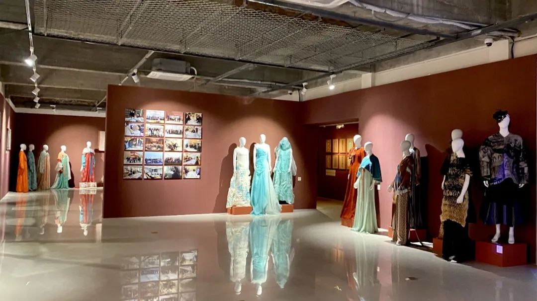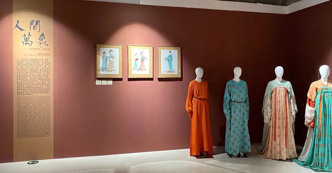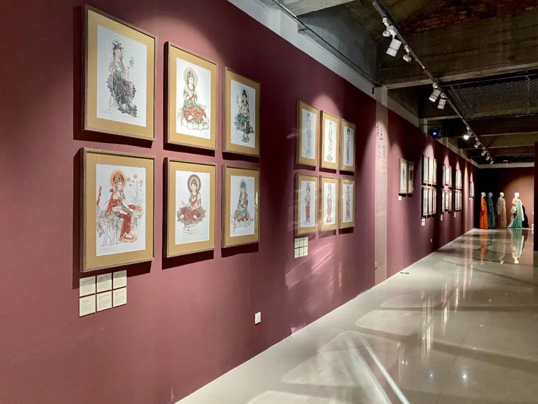 此次展覽內容豐富,包括畫稿、藝術再現服飾、創新設計服飾、視頻、學術書籍、文創品等。展覽共分為前言、菩薩服飾、天人服飾、世俗人物服飾等幾大板塊,較為全面地反映了敦煌唐代服飾文化面貌,充分展示其厚重的文化內涵和多元的裝飾手段,為藝術設計和理論研究工作者提供了生動鮮活、豐厚細致的學習研究資源。