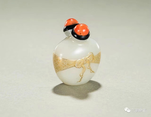 第二件作品是巧奪天工的鼻煙壺,采用獨特的金鑲玉工藝,將兩種貴重材質完美結合,還可一分為二,設計新穎,別具一格,精致小巧,展現了內斂的奢華之美。