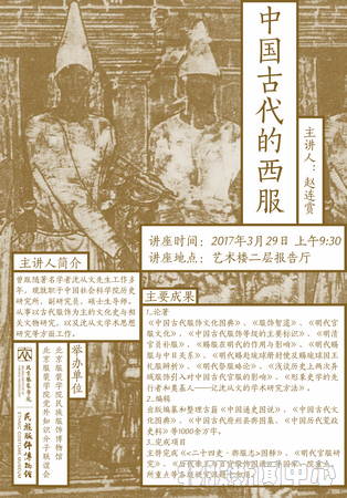 講座題目:中國古代的西服主講人:趙連賞講座時間:2017-03-29,上午9:30講座地點:7號樓(藝術樓)二層報告廳主辦單位:北京服裝學院民族服飾博物館北京服裝學院黨外知識分子聯誼會