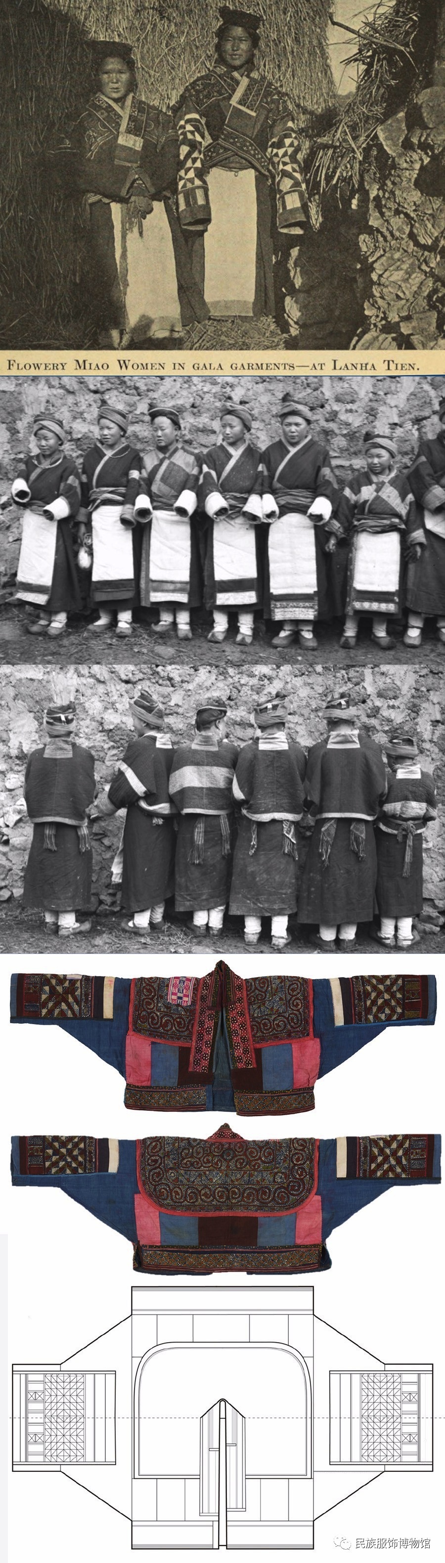 苗族服飾中的直線平面裁剪結(jié)構(gòu),源自于中國傳統(tǒng)“節(jié)用”、“惜物”的造物觀。方法簡單易學(xué),通過比例關(guān)系、剪裁尺度的設(shè)計經(jīng)營,可以變化出多種造型。縫合方式和穿著方式使一件平面的衣服變得立體,滿足穿著功能和審美的雙重需要。