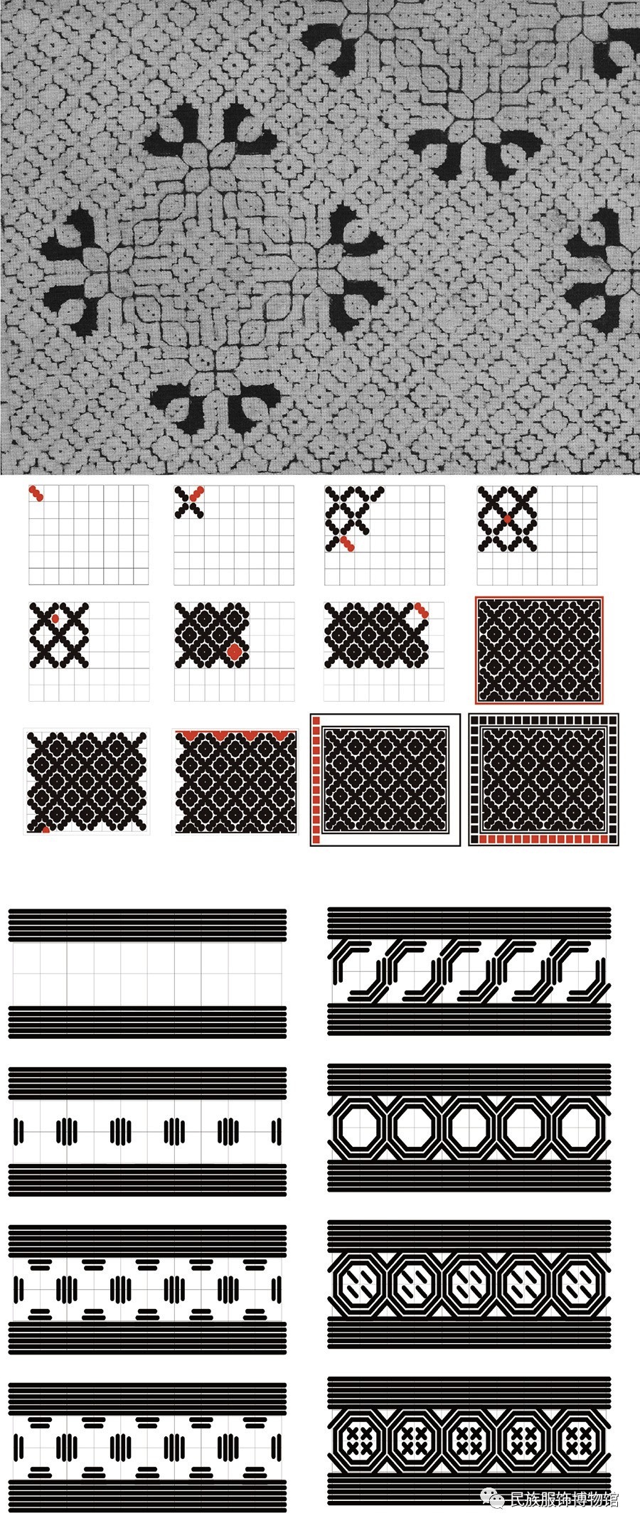苗族服飾直線平面結(jié)構(gòu)與穿著的效果蠟染紋樣以九宮格和米字格的結(jié)構(gòu)為構(gòu)成基礎(chǔ),配合直線、曲線、圓點、圓圈、扇形、方形、三角形、鋸齒形等簡單元素,組合成二方連續(xù)、四方連續(xù)的樣式,變化多樣。繪制程序化的傳承模式,技藝門檻低,每一個普通女孩都可以掌握,這是祖先留下的方法,具有普適性,更蘊含深刻的仁厚與慈悲。一旦入門后,又有極大地發(fā)揮空間與彈性,可以精進到更高的境界,這是傳統(tǒng)的玄思與力量。
