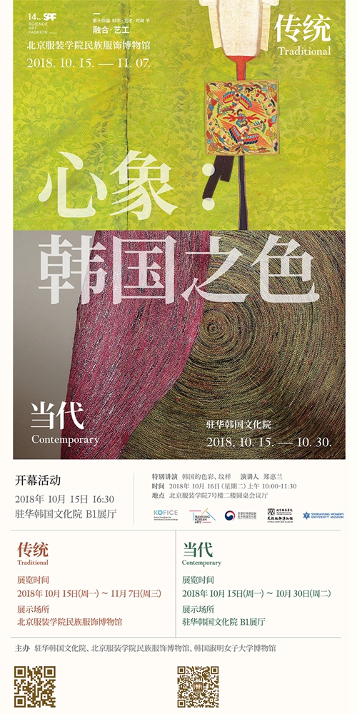 10月15日,作為北京服裝學院第十四屆“科學·藝術·時尚”節的重要活動之一,由北京服裝學院民族服飾博物館、韓國淑明女子大學博物館、駐華韓國文化院共同舉辦的“心象:韓國之色,傳統”展覽將在北京服裝學院民族服飾博物館舉辦。