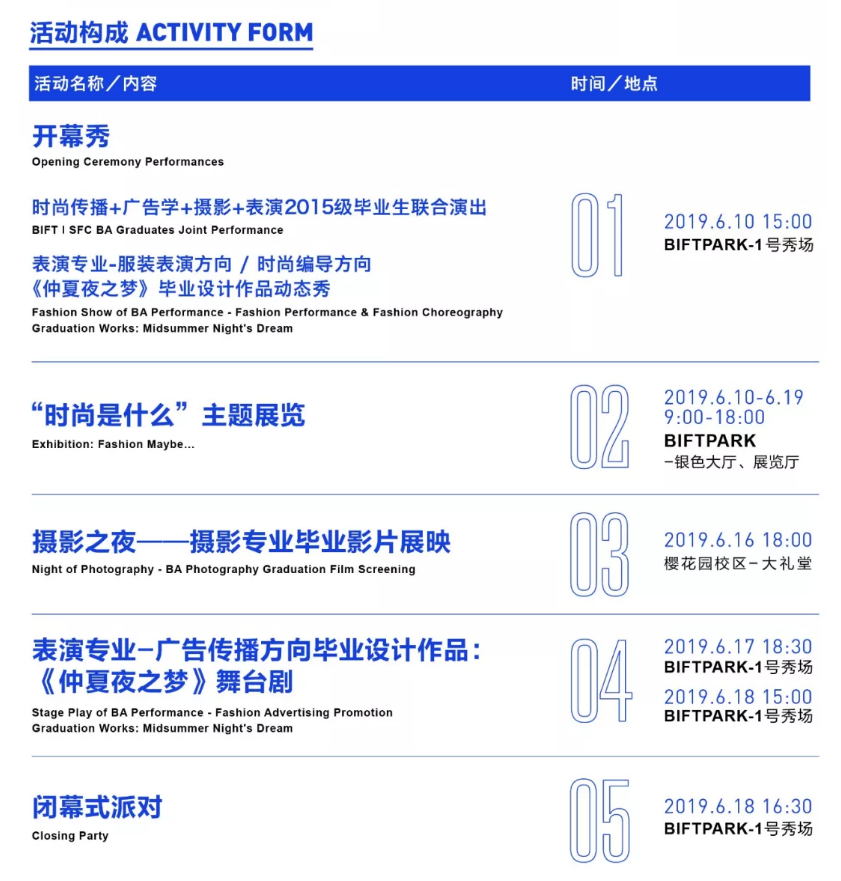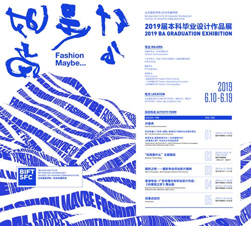 As a newly-established college, the School of Fashion Communication, BIFT isstriving for innovation. Graduation design exhibition, opening show, photography night, and stage drama cast by the first graduates of Fashion Advertising Promotion present the 2019 BA graduates' meditation and recognition of the concept of fashion, their majors and their own development, as well as the unique interdisciplinary characteristics of the School of Fashion Communication. The debut of 2019 BA Graduation Design Exhibition highlights the school spirit of facing toward and embracing the future, and marching along with beauty. At the same time, it carries forward the youth theme of the graduation season of the 2018 Fashion Carnival. Through the opening show and closing ceremony party of the 2019 BA Graduation Design Exhibition, it crystallizes the physical and emotional well-being of all the faculty and students of the school, and jointly extends a good wish for all the Class2019 graduates by joining hands with artists both on and off campus:
