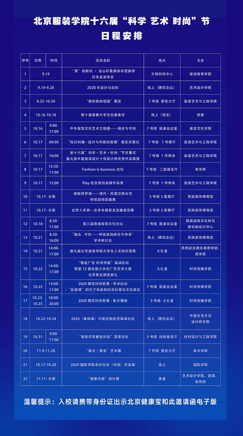 北京服裝學院2020年第十六屆“科學·藝術·時尚”節定于10月17日(星期六)上午舉行開幕式。