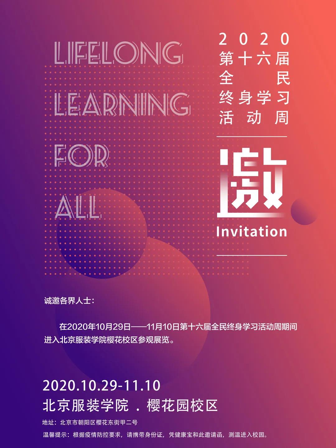 為落實《教育部辦公廳關(guān)于舉辦2020年全民終身學(xué)習(xí)活動周的通知》,繼續(xù)推進(jìn)全市學(xué)習(xí)型城市建設(shè),北京服裝學(xué)院于10月29日——11月9日期間舉辦“北京市第十六屆全民終身學(xué)習(xí)活動周”學(xué)習(xí)活動,具體活動如下: