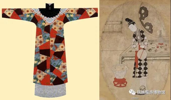 有一種觀點認為,水田衣是模仿出家人裝扮出現的流行元素,到了明清時期,隨著戲曲的不斷發展,角色演出服裝更加細化,出現了女尼角色特定穿著的幾何形狀拼布戲服,兜兜轉轉,仿佛又回歸了百衲衣的初衷。