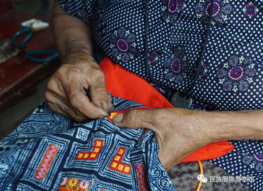 苗族婦女在蠟染百褶裙上拼縫貼花