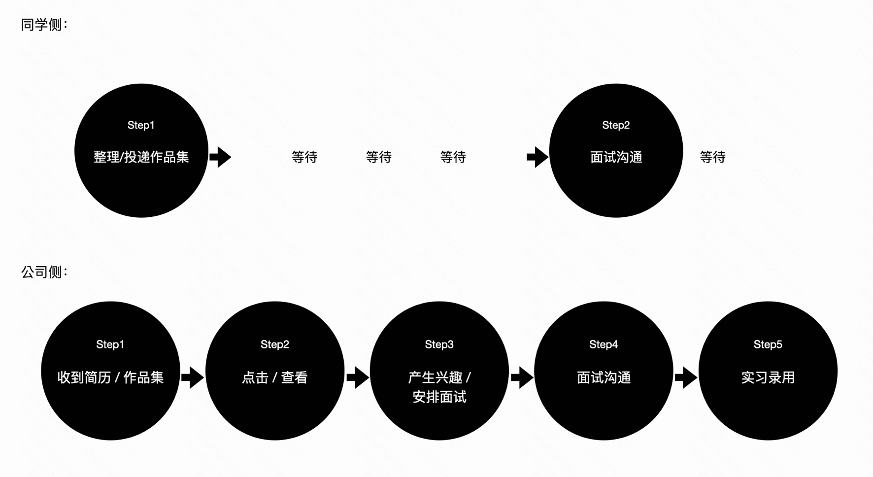 那么面試的“終點(diǎn)”是什么? 下圖為實(shí)習(xí)生招聘的具體流程,其中分為兩個(gè)角度出發(fā),從學(xué)生角度來看當(dāng)學(xué)生選擇應(yīng)聘某家公司時(shí)會預(yù)先準(zhǔn)備相關(guān)作品集進(jìn)行投遞,在這之后會經(jīng)過一段等待時(shí)間,而這一階段時(shí)間是公司考慮應(yīng)聘者是否符合所需崗位標(biāo)準(zhǔn)的初步階段,當(dāng)HR對某位應(yīng)聘者產(chǎn)生興趣或符合要求時(shí),公司會安排進(jìn)行面試階段,如果面試通過后便達(dá)到了本階段最終的“終點(diǎn)”——實(shí)習(xí)錄用階段。