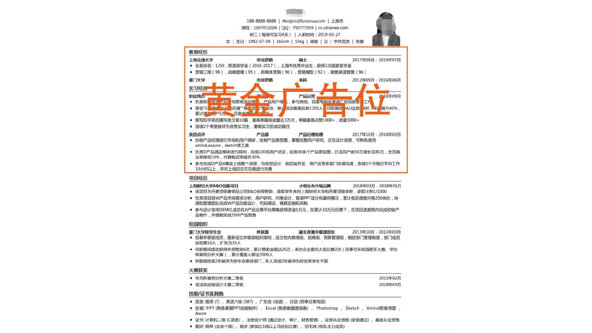 一份好的簡歷突出求職者專長尤為重要,這一點(diǎn)會吸引更多面試官的青睞。其中應(yīng)包含三個(gè)關(guān)鍵詞:真實(shí)、簡潔與獨(dú)特。而多數(shù)人簡歷內(nèi)容是較為多余的,一般包括:缺乏意義的自薦信、無效的自我評價(jià)、瘋狂輸出超過一頁的簡歷、不知名的獎項(xiàng)以及大家都會使用的軟件,這些內(nèi)容放在簡歷中并不能幫助求職者加分,反而會顯得簡歷更加繁雜缺乏吸引性。