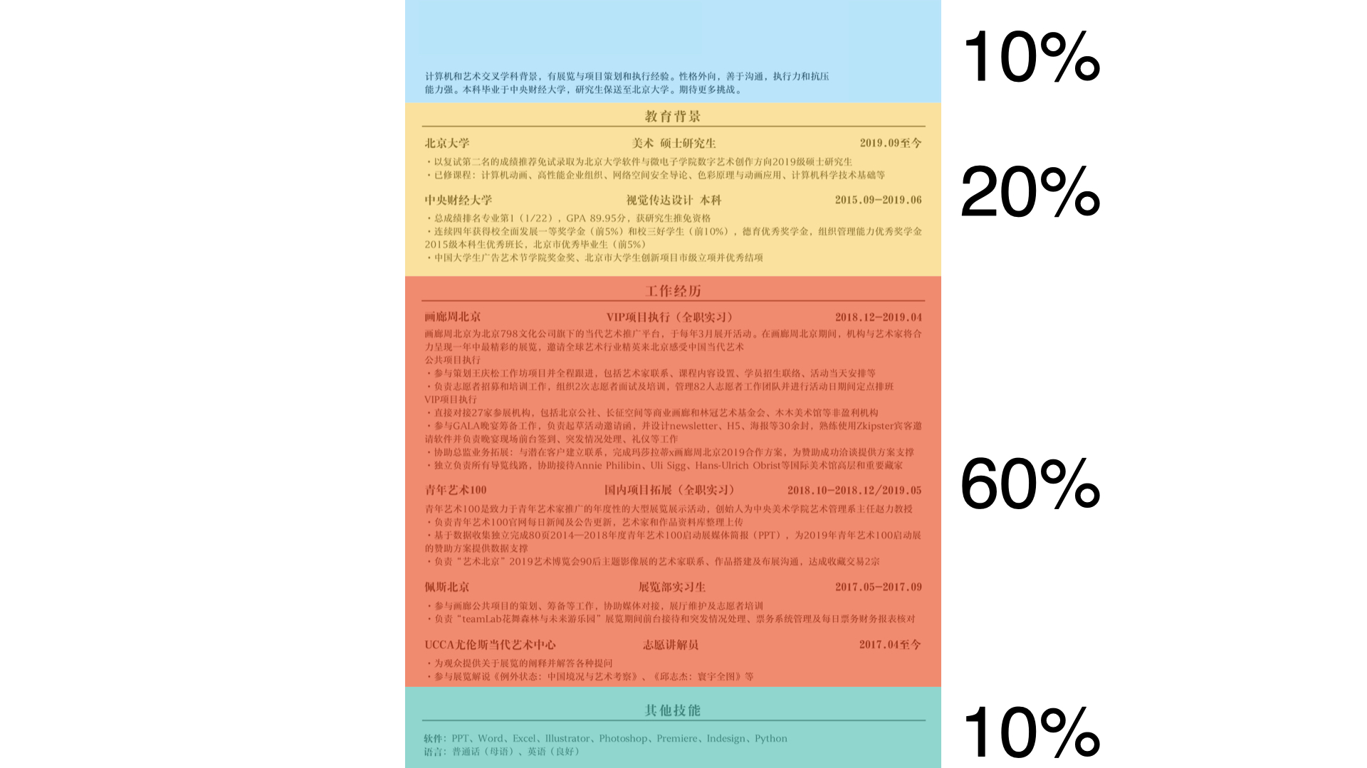 一張看似簡單的簡歷排版也包含著合理的規(guī)劃性,如何在有限的空間中更好的“推銷”自己,擁有一個(gè)更為合理的布局安排尤為重要。其中布局占比可以分為:個(gè)人信息10%、學(xué)習(xí)經(jīng)歷30%、實(shí)習(xí)與工作經(jīng)歷30%、社團(tuán)經(jīng)歷10%、榮譽(yù)證書20%,對于學(xué)習(xí)經(jīng)歷與實(shí)習(xí)工作經(jīng)歷應(yīng)在簡歷排版中占比應(yīng)更多。