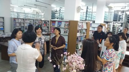 副館長于紅瑋首先陪同山東工藝美術學院圖書館一行參觀了我校圖書館中外文書庫、多功能室、多媒體學習中心,以及四個不同館藏特色的紙質書刊閱覽室,并介紹了每個房間的館藏及功能特色,同時還參觀了采編部、技術部等業務部門。雙方館員就館舍設計、藝術類書刊存放、環境美化、人員配備等細節進行了簡單交流。