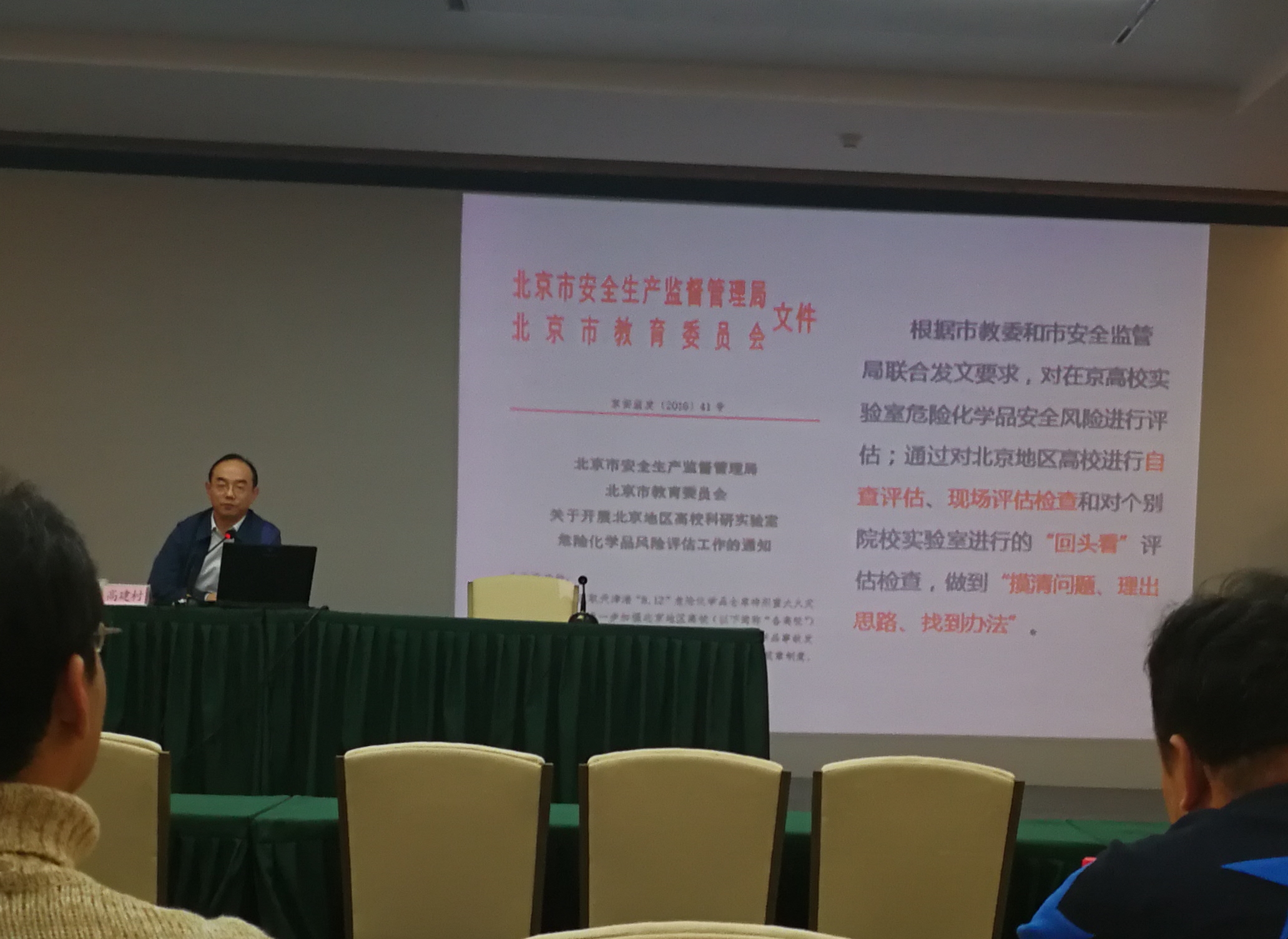 本次培訓(xùn)會主講人為石油化工學(xué)院安全工程學(xué)院院長高建村,高建村院長介紹了北京市高等院校實驗室現(xiàn)狀,重點指出實驗室存在的薄弱環(huán)節(jié)以及安全隱患,并借助幾個優(yōu)質(zhì)實驗室案例為各高校實驗室安全管理和安全應(yīng)急應(yīng)對提供借鑒,提出北京市建立高等院校實驗室安全統(tǒng)一管理平臺的建議和意見。接下來,高院長又從背景、思路、參考文件、意義等多個角度對《高等院校實驗室危險化學(xué)品安全管理規(guī)范(試行)》進行了詳細的解讀。