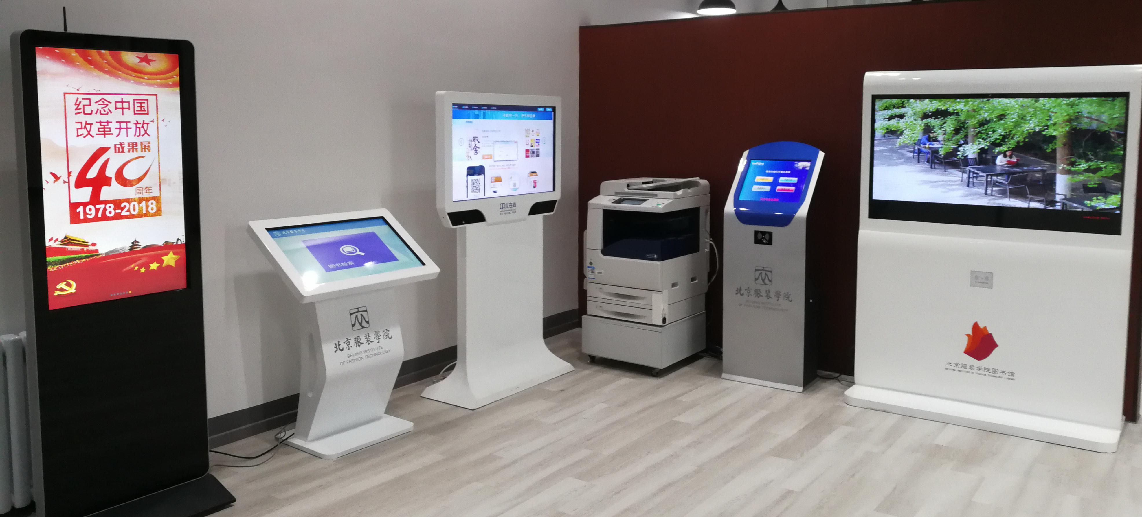 知識學習中心位于圖書館一層B105房間,整體劃分為自助服務區、休閑閱覽區、小組研討室、多媒體學習區四個分區。其中自助服務區提供有書刊檢索機、自助打印復印掃描一體機、電子讀報機、電子書借閱機等,可利用資源包括電子圖書33000冊、電子期刊1162種、電子報紙 200 種;休閑閱覽區共有不同類型的座位24個,供讀者學習閱覽、休閑交流;小組研討室共有2間,配有65寸LED屏幕/互動電子白板,最多可容納20人,3名以上讀者即可通過圖書館公眾號在線預約使用;多媒體學習區目前配有18個座位、9臺閱覽一體機,讀者可以在此使用圖書館海量的數字資源。