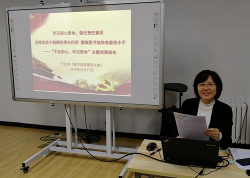 根據學校黨委“不忘初心、牢記使命”主題教育總體部署安排,結合近期圖書館開展主題教育學習實際情況和各部門座談、調研反饋問題,10月17日下午,圖書館直屬黨支部書記于紅瑋在圖書館二層多功能室講授“牢記初心使命,強化責任意識——發揮黨員干部模范帶頭作用,提高圖書館信息服務水平”專題黨課。
