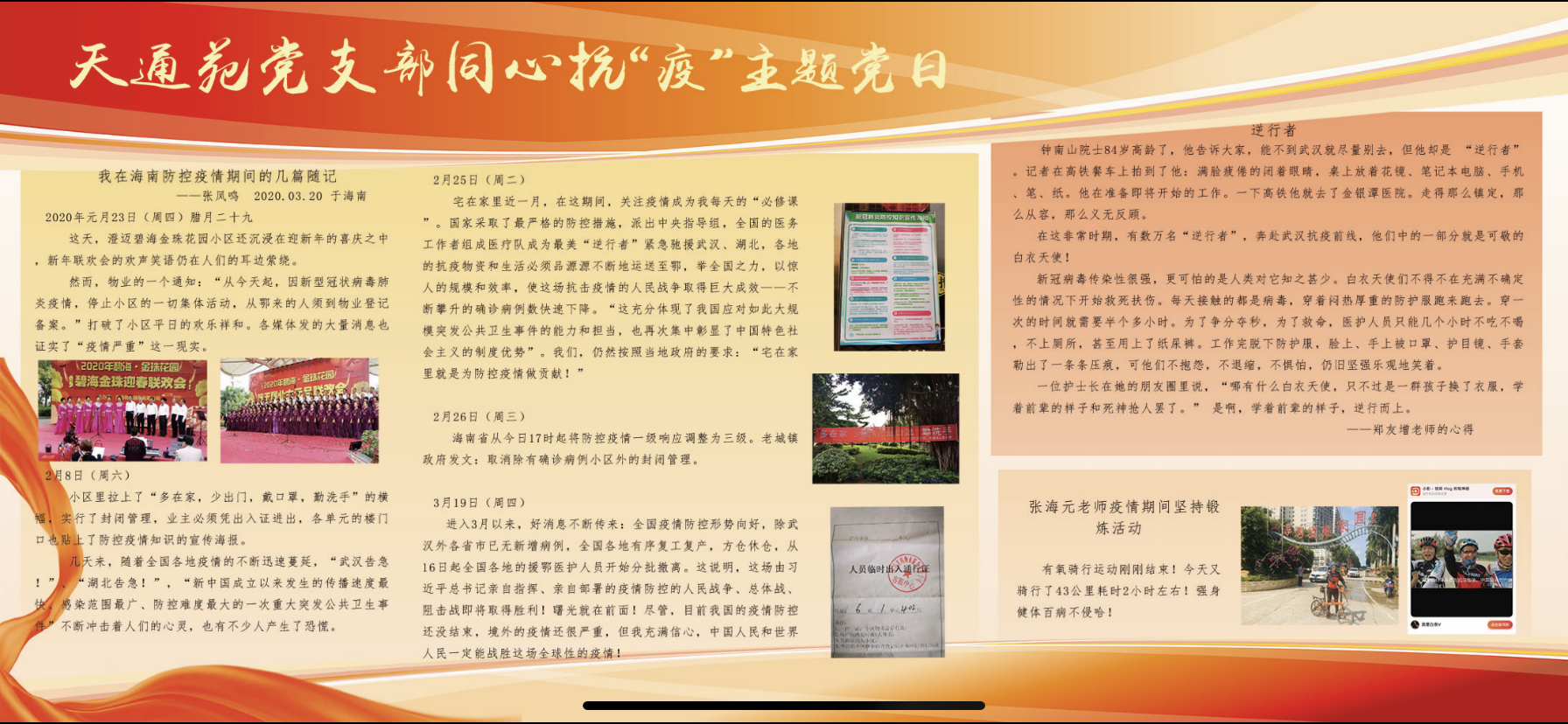 此次網上主題黨日結束后,天通苑支部將黨員們上交的作品材料制作成電子板報,在微信群中交流傳閱。主題黨日活動正值抗疫非常時期,老黨員們用特殊的方式表達了對黨和國家的熱愛、對美好生活的追求,對打贏疫情防控阻擊戰的決心和信心,以實際行動讓黨旗在疫情防控阻擊戰中高高飄揚。