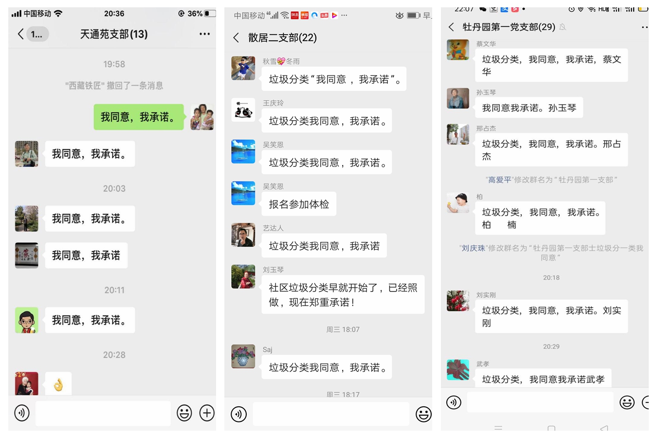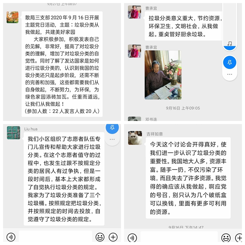 散居第三黨支部通過微信群組織屬地黨員群眾集體學(xué)習(xí)了垃圾分類有關(guān)知識,并就學(xué)習(xí)內(nèi)容展開討論。通過學(xué)習(xí),提高了黨員群眾對垃圾分類的理解,增加了垃圾分類的自覺性;同時了解了發(fā)達(dá)國家是如何進行垃圾分類的,認(rèn)識到我國的垃圾分類還只是起步階段,還需不斷的完善和加強。這些都需要從自身做起,不斷努力,為北京環(huán)保、為建設(shè)美麗的綠色家園添磚加瓦。
