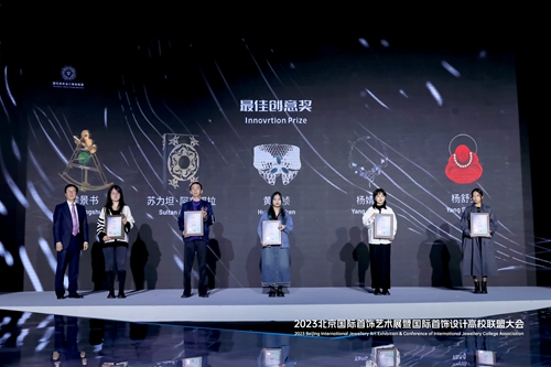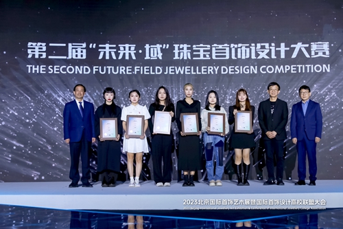 同期舉行了“未來·域”首飾設計全球競賽及頒獎禮。大賽是由國際首飾設計高校聯盟主辦的年度重點賽事,本屆緊扣“未來”主題,評審委員會根據概念的先鋒性、視覺的創新性、工藝的完成度,圍繞未來價值、社會價值、市場應用等進行討論評選,最終評選出獲獎作品(獲獎名單見下圖)。北京服裝學院黨委副書記倪賽力,黨委常委、副院長詹炳宏,第三屆國際首飾設計聯盟主席王敏,百泰集團創始人周桃林為獲獎代表頒發證書和獎杯。