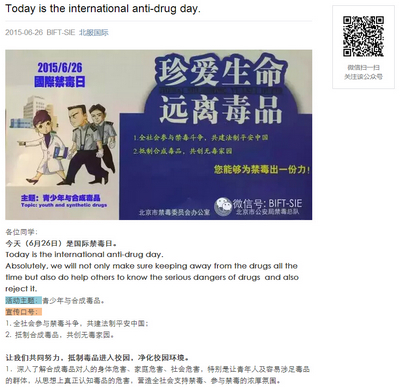 為配合國(guó)際禁毒日,根據(jù)北京市公安局出入境管理局號(hào)召,國(guó)際學(xué)院于6月24-26日開(kāi)展了系列宣傳活動(dòng)。今年活動(dòng)的主題是:青少年與合成毒品。宣傳口號(hào)是:全社會(huì)參與禁毒斗爭(zhēng),共建法制平安中國(guó);抵制合成毒品,共創(chuàng)無(wú)毒家園。