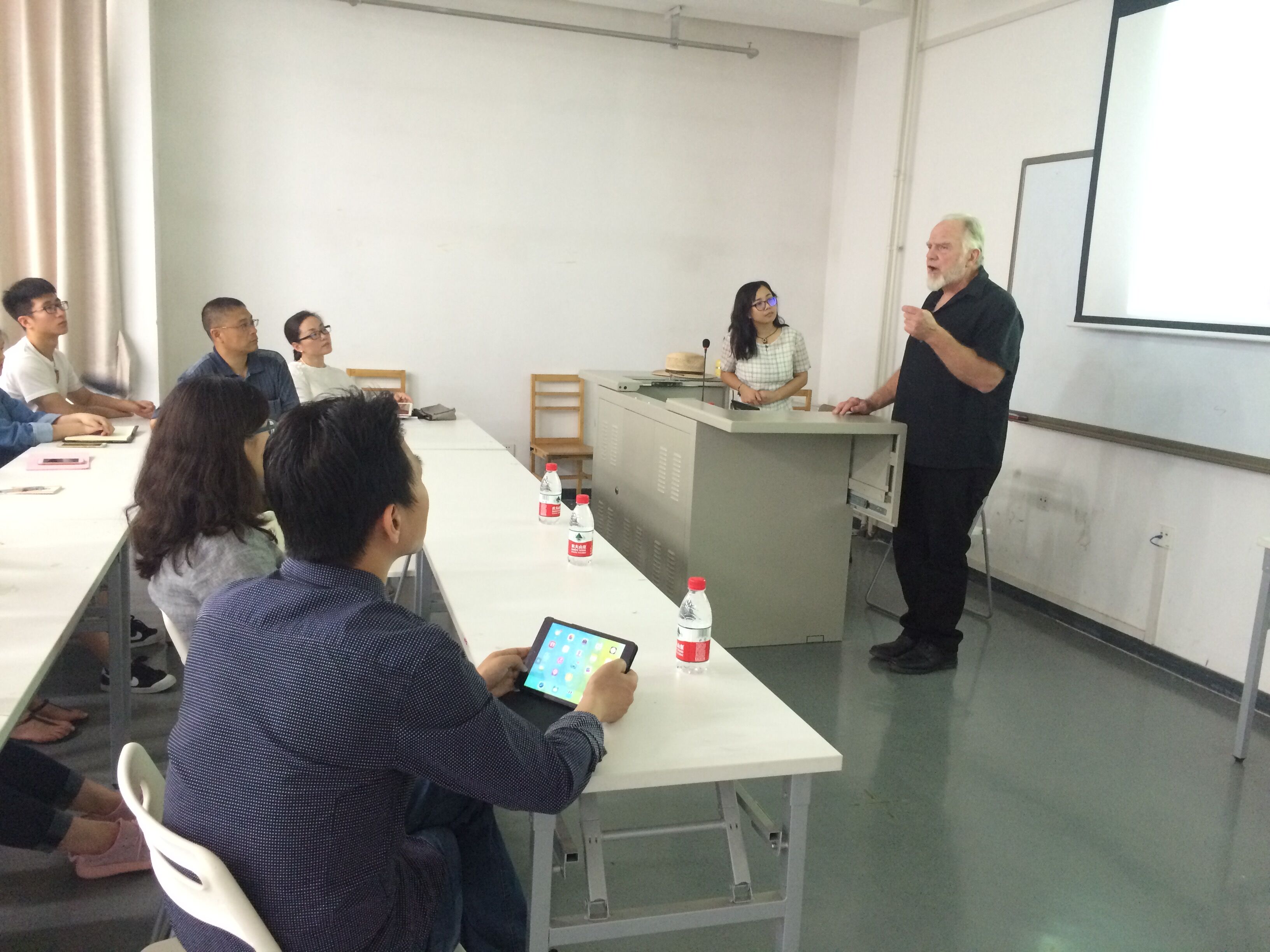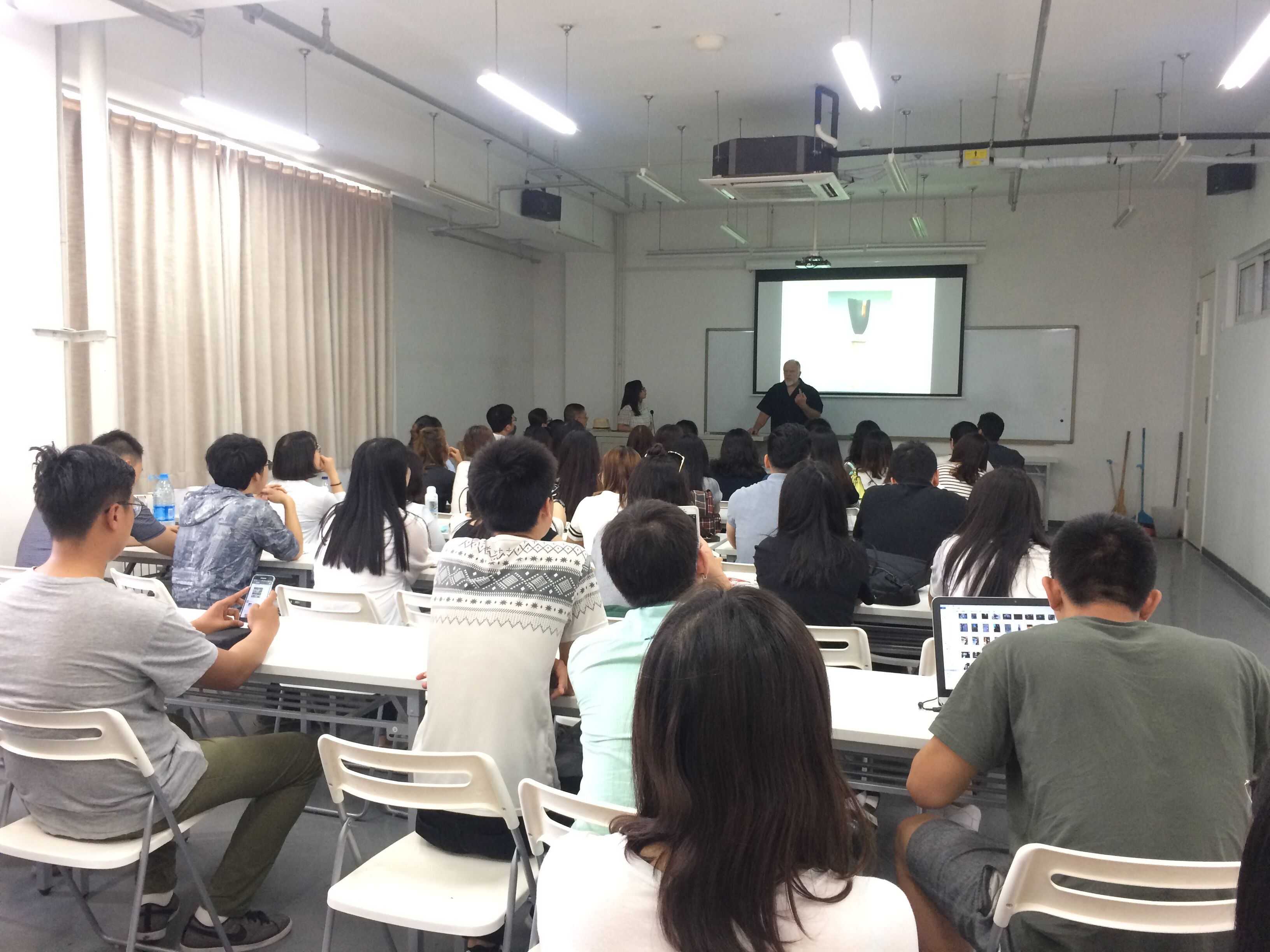 Kenneth Payne教授幽默風趣地為我系師生講解了他的諸多作品及其創作故事,現場座無虛席、氣氛積極活躍。講座最后,Kenneth Payne教授還接受了同學們的熱情提問,在交流中強調夸張炫目或靜穆素雅的作品吸引力的重要性,作品的精神內涵和它要表達的思想是成功與否的關鍵,觀者看到的作品的美不該是瞬間的,而是能夠讓人印象深刻并回味無窮的。