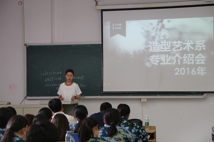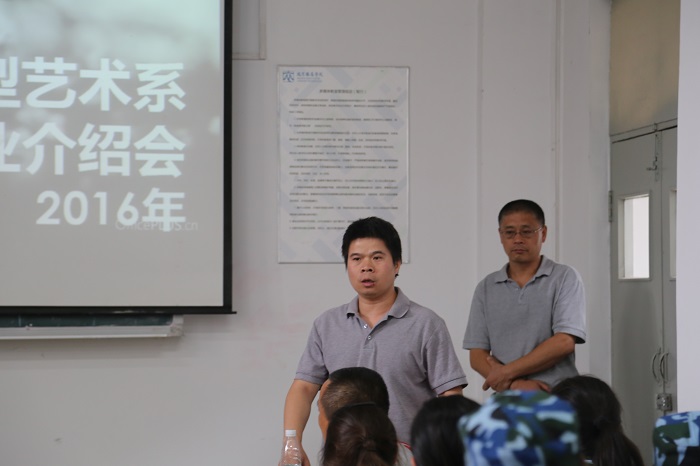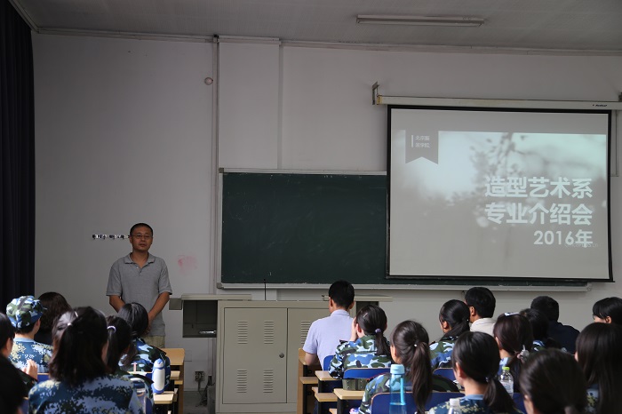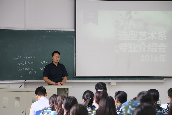 接下來各個專業的老師依次介紹專業方向。首先由雕塑教研室主任劉玉庭教授介紹雕塑專業的發展歷程,師資情況以及歷年來的一些教學成果。大學四年的課程大致安排為:造型基礎、胸像、人像、解剖、工藝課程、創作等。教學特點注重實踐性,強調技術性以及畢業后的發展方向;公共藝術教研室田輝教授從“公共空間內藝術品的設計”概念讓同學們了解了這個相對比較陌生的專業,對這個專業的表現形式和發展方向有了進一步的認識,通過材料的多樣性和形式的豐富性使學生大大提高了對公共藝術專業的興趣。并且還介紹了往屆優秀畢業生的發展情況,讓同學們對藝術創作又有了新的理解;中國畫教研室副主任安佳教授介紹課程內容和授課方向,并詳細介紹各位專業老師及在領域取得的成績,使新生對這一專業有了相應的了解和認識,并分享了中國畫的一些學習方法,強調同學們應多運用課余時間看展覽打開眼界;油畫教研室郭文寧副教授簡單闡述油畫專業的起源、發展、現狀。課程主要分為三個階段:一是基礎課程,二是油畫技巧與技法,三是創作。其中油畫技巧與技法分成三個層次,程度分別從大一到大四逐層加深,逐步提高油畫技法難度,逐漸加入創作的部分,在每學期也會有外出寫生和考察的課程,領略各地的名勝和文化。通過老師的介紹,大大增強了同學們的學習興趣。
