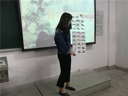 獲獎同學一一上場講解了他們的詩句并把作品展示給同學們看,每個同學講解的方式各有不同,和他們的詩作一樣,有的內斂含蓄,有的大方得體。最后由美術學院的輔導員兼此次比賽的評審李穎老師上臺和大家總結此次比賽。她闡述的內容分為三大塊,首先通過這次弘揚傳統文化的書法比賽希望大家能對書法更加的重視,多發揚中國傳統文化,書法對于我們的專業有極大的幫助,所以要勤練并且重視。其次李老師希望同學們多多練習演講技巧和與人溝通能力,這是對于我們專業和人際交往有著極大的幫助,要多鍛煉自己的說話之道和勇氣,這是必須要學會的技能。最后她提到如古詩詞傳達的情懷,面對生活中的挫敗,我們需要有勇氣的自己去解決和面對。同學們對此都有深刻的影響。