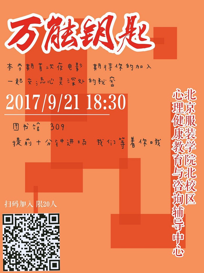 此次“夜電影”活動為大家準備的是美國電影《萬能鑰匙》。心晴公社的部分社員在二十日下午就已經布置好了溫馨的心理活動室,又一次次調試了放映設備,希望參加活動的同學能得到最好的觀影體驗。