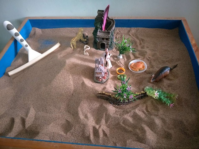 在構建沙盤世界時,每個人都會忘我地沉浸在自己的世界,使得思想集中,更能清楚地面對自己的內心。構建完成后,仿佛找到一個情緒發泄的出口,沒有咆哮,沒有眼淚,就是平靜的,讓心中情緒如流水般悄悄流逝,這便是沙盤游戲的奧妙所在。不少同學構建起自己的沙盤世界,有的憧憬未來,有的表達自然哲學;有的看似雜亂毫無邏輯,卻又連著絲絲線索。每個人在沙盤游戲中尋找到樂趣,在完成今天的學業之余,還能夠有這樣美好的午后。這亦是心理咨詢中心存在的價值。