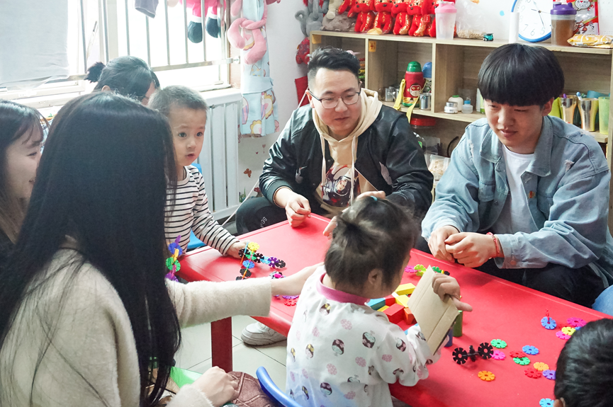 在學習完手指語后,同學們分成三組到班級里與孩子們互動。孩子們十分熱情,和同學們分享他們的玩具,一起拼拼圖、堆積木。雖然孩子們年齡小、有些吐字不清,但是他們會用表情、動作表達自己的意思,同學們也會盡力理解。