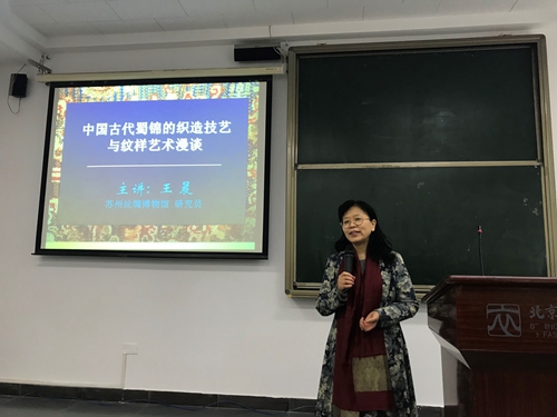 10月22日上午九點半,北京服裝學院材料設計與工程學院在材料實驗樓108室舉辦了一場古代蜀錦專題報告,特邀蘇州絲綢博物館研究員王晨老師作為主講嘉賓,帶來了題為“中國古代蜀錦的織造技藝與紋樣藝術漫談”的講座。